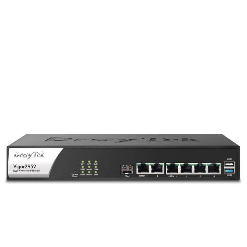- De DrayTek Vigor 2952 dual WAN security firewall combineert snelle internettoegang met uitgebreide functionaliteiten zoals VPN, object oriented firewall, multiple subnet, AP management en Gigabit LAN. Deze functionaliteiten maken de router uitermate geschikt voor zakelijke toepassingen. De dual WAN optie met load balancing en fail over zorgt voor een hogere betrouwbaarheid van de internetverbinding. Het n-model beschikt over een 802.11n wireless access point en uitgebreide wireless functionaliteiten. Dit product wordt geleverd in een metalen behuizing en kan eenvoudig in een 19″ patchkast worden gemonteerd.